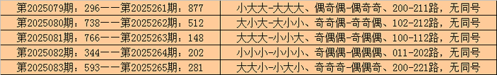 在排列三历史开奖中,第2025079期-第2025083期连续5期奖号为:296-738-766-344-593。